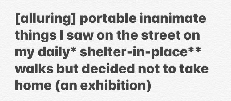 [alluring] portable inanimate things I saw on the street on my daily* shelter-in-place** walks but decided not to take home (an exhibition)